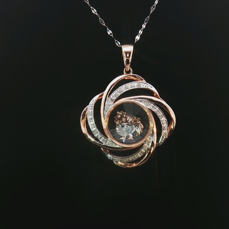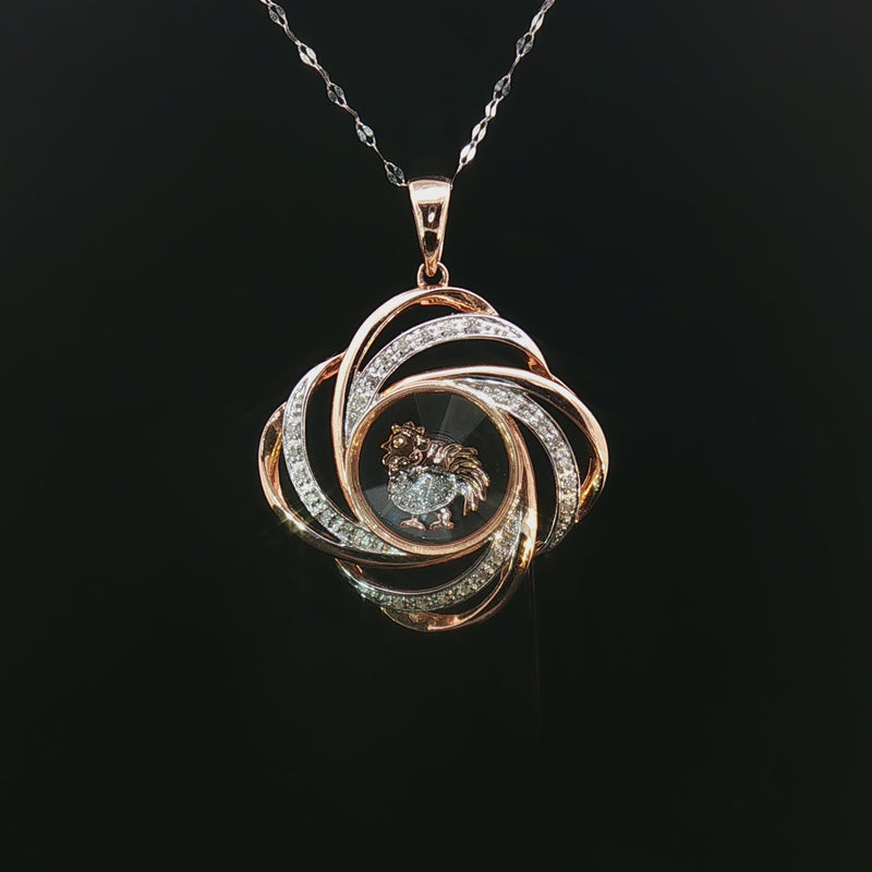 14k Rose & White Gold Rooster Windmill Pendant – 0.12ct Natural Round Brilliant Diamond Accents