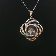Adorning the flowing design are 0.12 total carat weight of natural round brilliant-cut diamonds, meticulously set to enhance sparkle and illuminate every curve of the pendant. The harmonious contrast of warm 14k rose gold and sleek 14k white gold elevates the elegance of the design, making it a versatile and luxurious accessory for any jewellery collection.