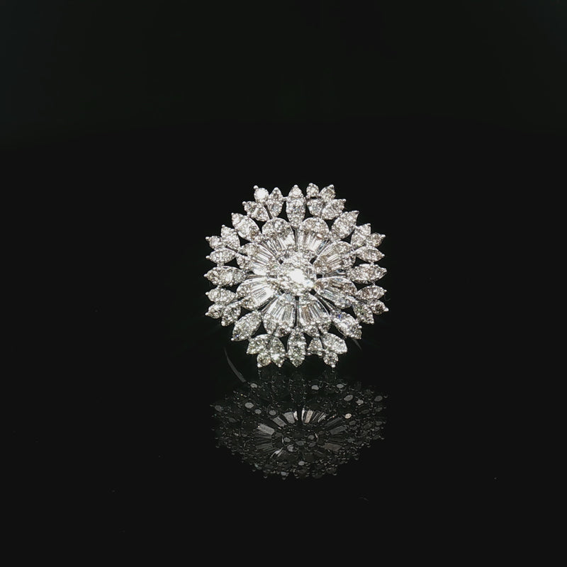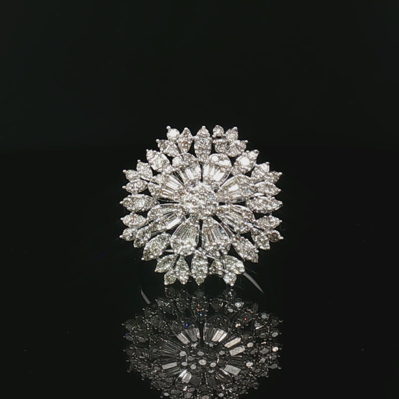 Indulge in the artistry and brilliance of this breathtaking 18k White Gold Flower Brooch Ring, crafted to deliver a striking 5-carat face illusion with extraordinary sparkle. Designed to evoke the elegance of a blooming flower, this statement ring features a dazzling 1.00 total carat weight of natural diamonds, meticulously arranged in an intricate cluster of round brilliant-cut and baguette-cut stones.