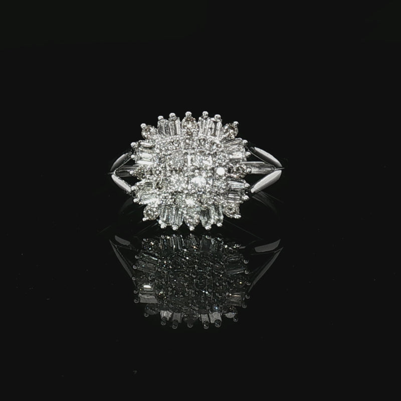 Indulge in the sophisticated brilliance of this 18k White Gold Multistone Cluster Square Ring, a captivating piece designed to elevate any jewellery collection. Crafted from luminous, high-polish white gold, this luxurious ring features an exquisite square cluster arrangement of baguette-cut and round brilliant natural diamonds, totalling 0.50 carats.