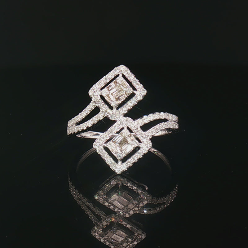 This ring combines artistry, geometry, and brilliance in a seamless design. The overlap effect adds contemporary flair, while the square halo illusion creates the appearance of a larger centre diamond—perfect for those who love exceptional sparkle without excess bulk. Whether worn as a cocktail ring, anniversary piece, or signature accessory, it promises effortless sophistication and undeniable glamour.