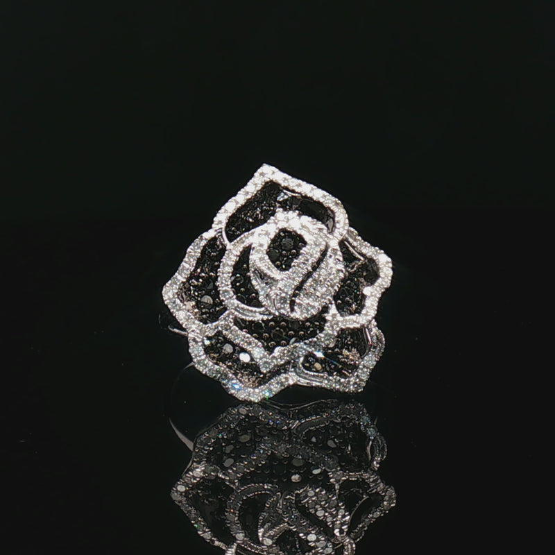 Make a bold and elegant statement with this breathtaking 18k White Gold Rose Design Cocktail Ring, exquisitely crafted to showcase artistic beauty and luxurious brilliance. Featuring a sculpted rose motif, this striking piece is adorned with 1.00 total carat weight of natural round brilliant-cut black and colourless diamonds, arranged in a captivating cluster to enhance depth, sparkle, and visual contrast.