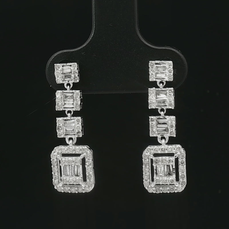 18k White Gold Square Dangle Earrings – 1.00ct Natural Round & Baguette Diamond Illusion Design