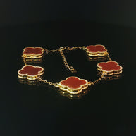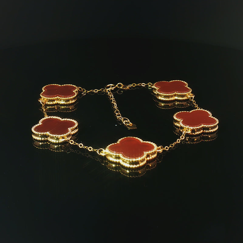 18k Yellow Gold 5-Clover Motif Bracelet – Red Agate Inlay, Adjustable Sizes (6–7" & 7–8")