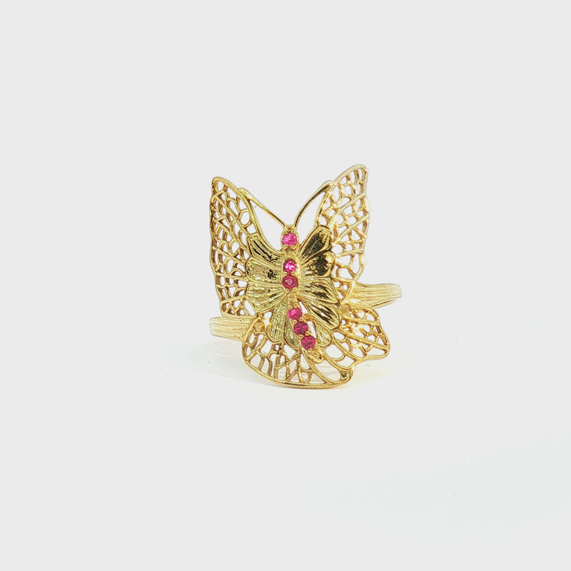 18k Yellow Gold Butterfly Cocktail Ring – 0.05ct Natural Ruby Accents Filigree Design