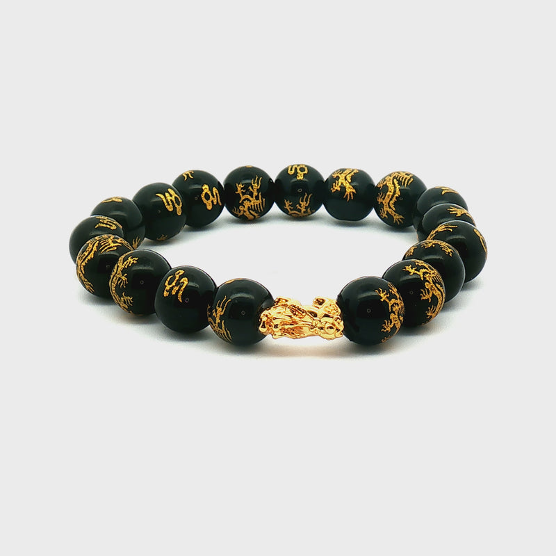 18k Yellow Gold Dragon Bracelet – Black Mantra Beads with Hollow Gold Dragon Charm