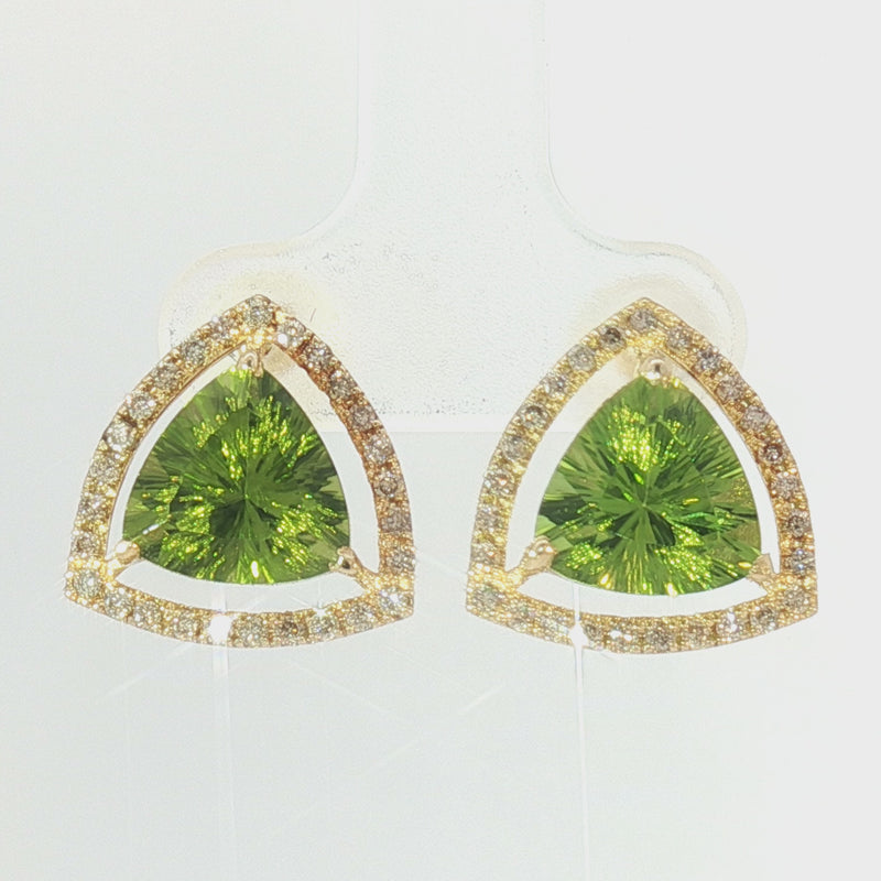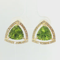 Enhance your jewellery collection with these elegant halo stud earrings. Showcasing a vibrant green peridot, the set of earring features a 5.00 total carat weight trillion cut natural peridot gemstone with a halo of 0.50tcw of round brilliant cut natural diamond, set in warm 18k yellow gold. These eye-catching earrings are ideal for adding a sophisticated touch to any ensemble.. The total mass of earrings is 3.235 grams and comes with certificate.