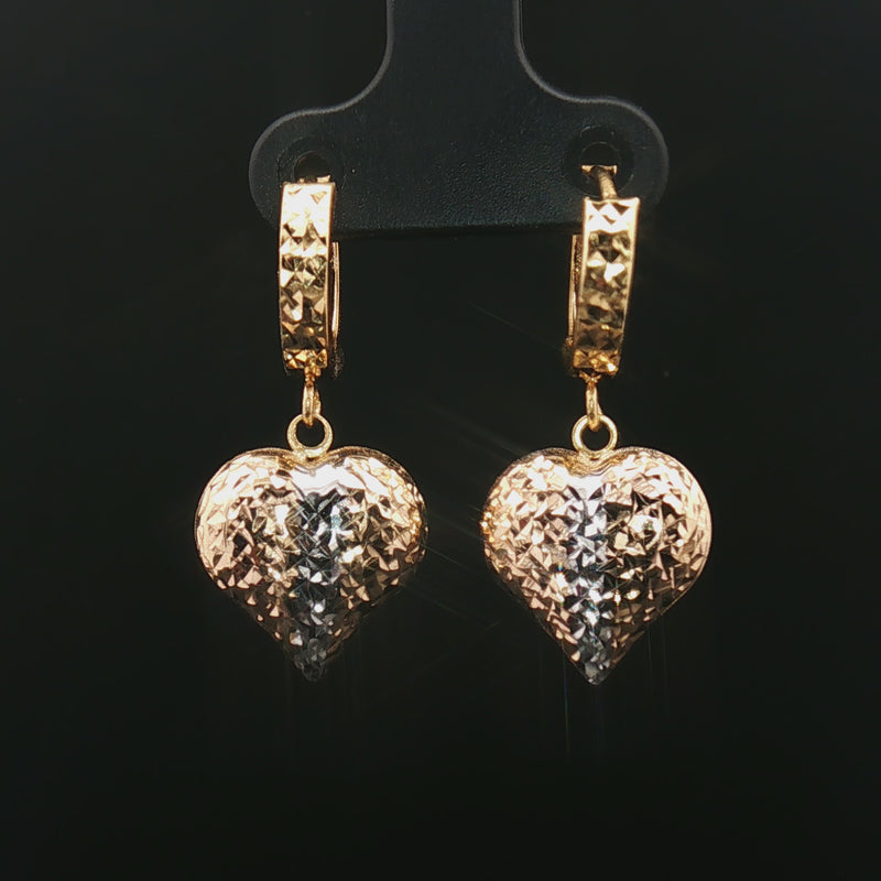 18k Yellow Gold Tri-Colour Heart Dangle Earrings – Textured Yellow, Rose & White Gold Hearts
