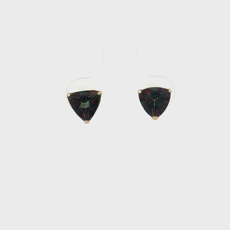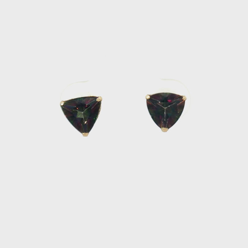 18k Yellow Gold Stud Earrings with 2.80tcw Trillion Cut Rainbow Opal