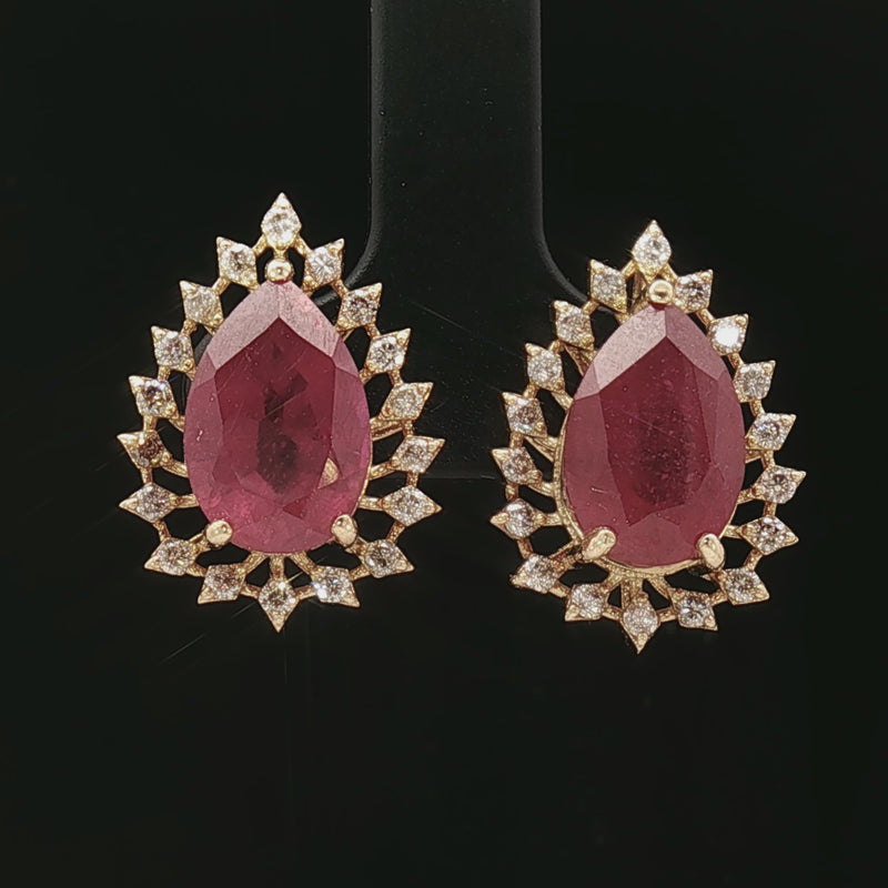 Indulge in the luxury and brilliance of these yellow gold ruby and diamond halo earrings, a true statement of passion, craftsmanship, and sophistication.